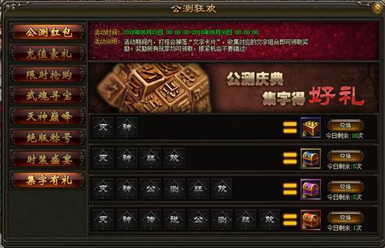 1. 公测活动期间内,击杀BOSS可掉落“文字卡片”,收集对应的文字组合即可领取对应奖励。所有玩家均可领取。