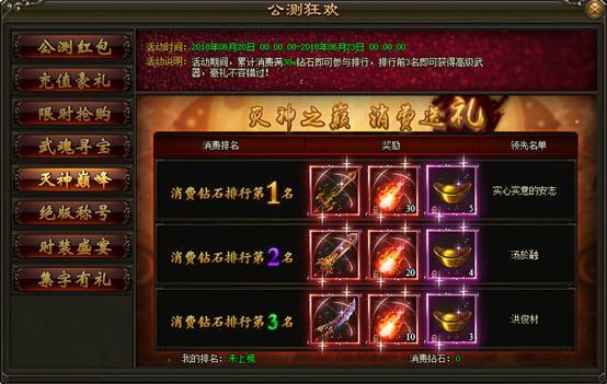 1. 活动期间内,累计消费满300000钻石即可参与排行,排行前3名的玩家可免费领取高级武器、焚天异火、海量元宝等海量豪礼