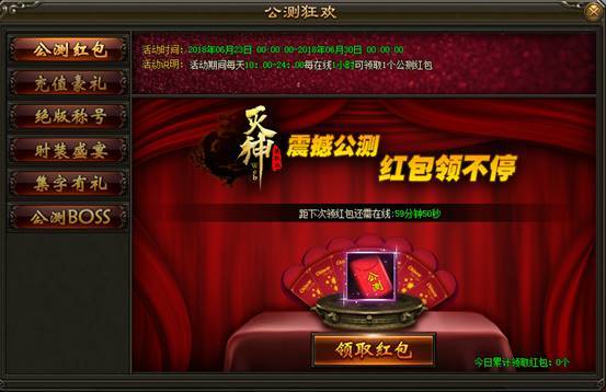 1. 在公测活动期间,从6月20日起根据开服时间持续7天,每天10:00至24:00每在线1个小时即可领取1个公测红包。