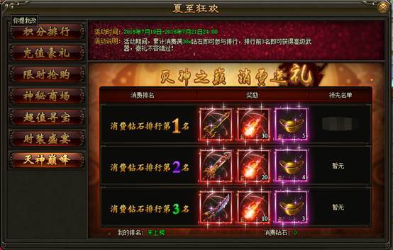 2. 活动期间内,累计消费满300000钻石即可参与排行,排行前3名的玩家可免费领取高级武器、焚天异火、海量元宝等海量豪礼
