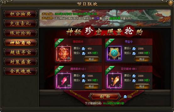 2. 活动期间内,神秘商场每日刷新各种珍稀道具,打折出售限量抢购。