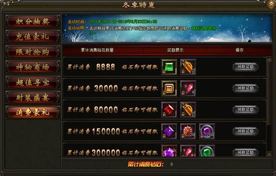 2. 活动期间内,消费指定档次的钻石可免费领取超级豪华礼包,更有高级攻击宝石、韧性宝石、九霄妖核、救赎妖核等稀有道具