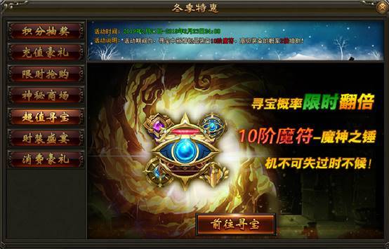 1. 活动期间,王之宝藏可抽取10阶魔符装备!高级装备概率翻倍!活动限时3天,机不可失过时不候
