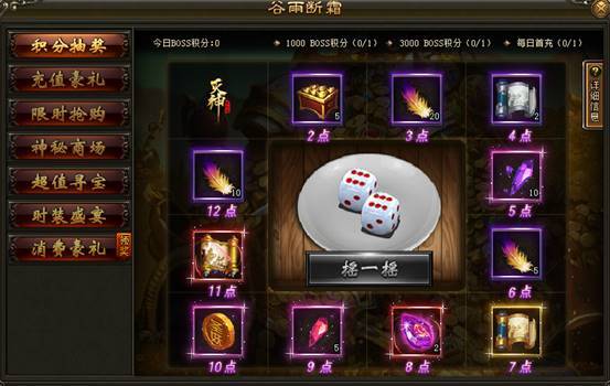 2. 活动期间内,玩家击杀boss可获得boss积分,boss积分数量达指定档次可免费投掷一次骰子,根据骰子点数可领取奖励。每日最多可获得三次