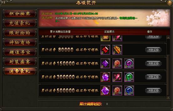 2. 活动期间内,消费指定档次的钻石可免费领取超级豪华礼包,更有高级攻击宝石、韧性宝石、九霄妖核、救赎妖核等稀有道具