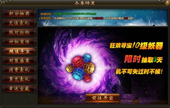 1. 活动期间,王之宝藏可抽取妖器装备!高级装备概率翻倍!活动限时3天,机不可失过时不候