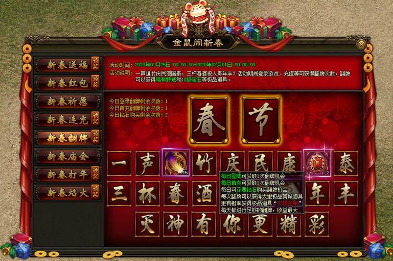 一声爆竹庆民康国泰,三杯春酒祝人寿年丰!活动期间登录游戏、充值等可获得翻牌次数,翻牌可以获得稀有特戒和10级宝石等极品道具。 |