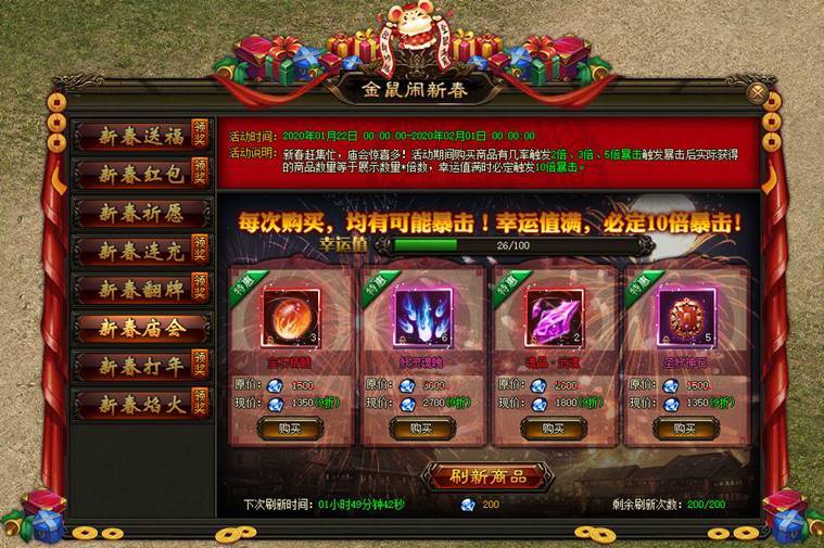 新春赶集忙,庙会惊喜多!活动期间购买商品有几率触发2倍、3倍、5倍暴击触发暴击后实际获得的商品数量等于展示数量*倍数,幸运值满时必定触发10倍暴击。 |