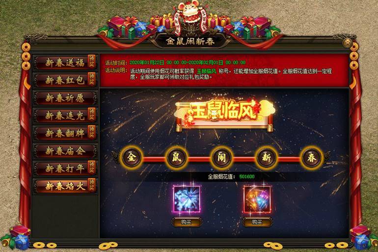 活动期间使用烟花可概率获得 玉鼠临风 称号,还能增加全服烟花值。 全服烟花值达到一定程度,全服玩家都可领取对应礼包奖励。 |