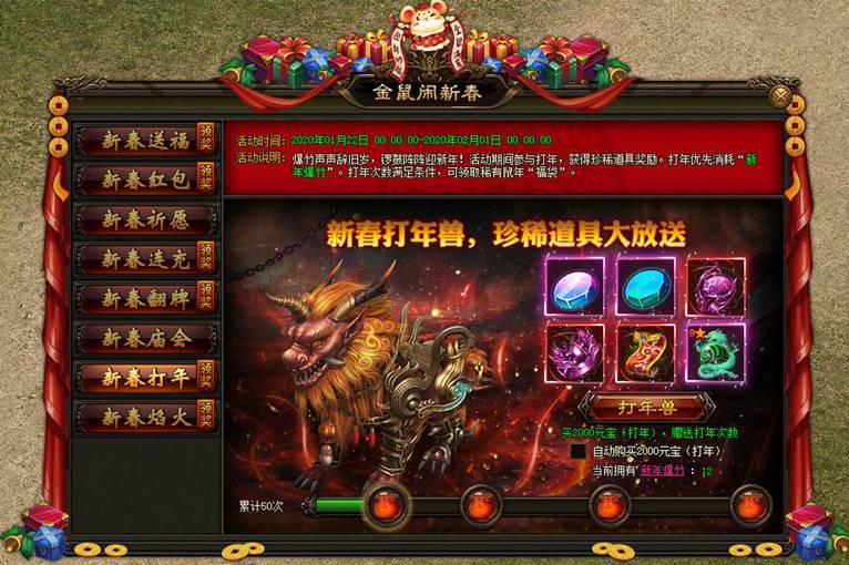 爆竹声声辞旧岁,锣鼓阵阵迎新年!活动期间参与打年,获得珍稀道具奖励。 打年优先消耗“新年爆竹”。打年次数满足条件,可领取稀有鼠年“福袋”。 |