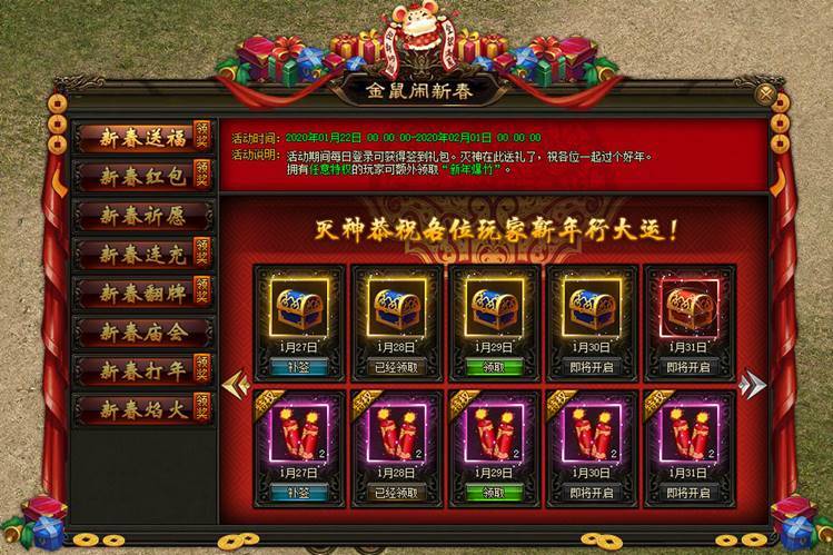 活动期间每日登录可获得签到礼包。灭神在此送礼了,祝各位一起过个好年。 拥有任意特权的玩家可额外领取“新年爆竹”。 |