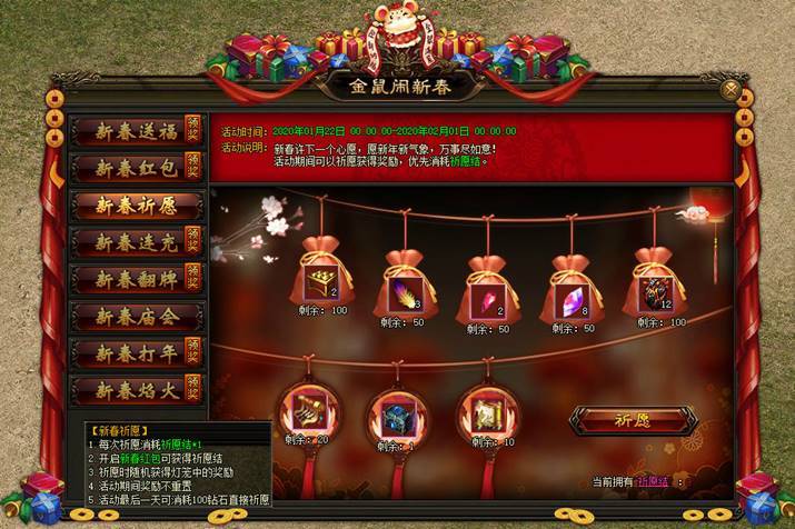 新春许下一个心愿,愿新年新气象,万事尽如意!活动期间可以祈愿获得奖励,优先消耗祈愿结。 |