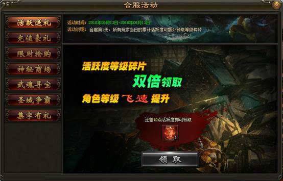 2. 活动期间内,完成活跃度任务可累计活跃度,到达指定活跃度点数即可领取等级碎片奖励。