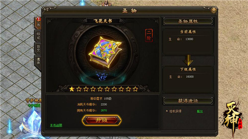 在《灭神》里,玩家们可以通过天书系统为角色增加生命,提升角色战斗力。当角色满足80级以上时,打开圣物系统,就可以对天书进行升级。天书的升级方式主要是消耗天书残片,天书残片分为小、中、大,使用小碎片后可获得10天书精华,只用中碎片后可获得100天书精华。