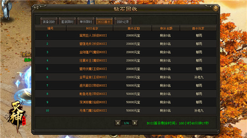 除了装备、套装和单件物品的回收兑换,“钻石回收”玩法中还有一项超给力的福利内容,那就是“BOSS首杀”,限时七天,手刃全服最强BOSS,就可以获得最高40W元宝的奖励!同样有名额限制,需要找到尚未击杀的BOSS,只要完成首杀就可以获得元宝奖励,除此之外还会掉落丰厚的装备、武器、材料等,扩充你的资源库,让你在《灭神》里尽情驰骋!
