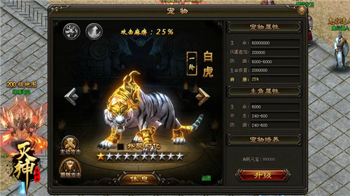 进入宠物系统后,我们可以看到页面左侧的内容:一阶宠物白虎、主动攻击/跟随攻击、空白星星,右侧则显示宠物属性(生命、伤害追加、防御、生命恢复、麻痹)主角属性(生命、攻击、防御),宠物培养(显示消耗元宝数量),还有升级按钮。只要积累相应数量的元宝点击升级按钮,就可以对宠物进行培养。