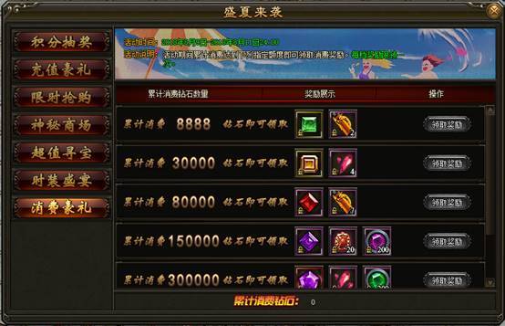 2. 活动期间内,消费指定档次的钻石可免费领取超级豪华礼包,更有高级攻击宝石、韧性宝石、九霄妖核、救赎妖核等稀有道具