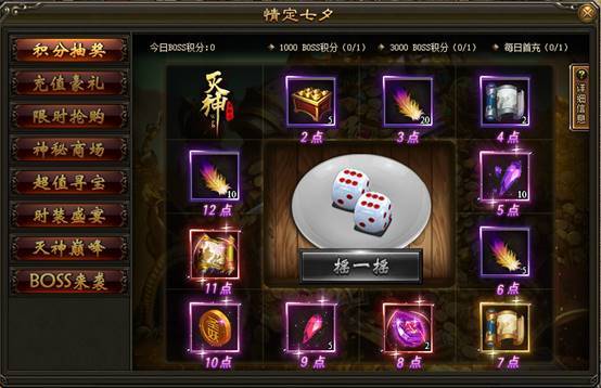 2. 活动期间内,玩家击杀boss可获得boss积分,boss积分数量达指定档次可免费投掷一次骰子,根据骰子点数可领取奖励。每日最多可获得三次