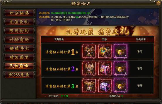 2. 活动期间内,累计消费满300000钻石即可参与排行,排行前3名的玩家可免费领取高级盔甲、灭神首饰箱、海量元宝等海量豪礼