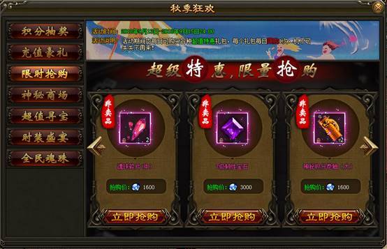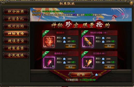 2. 活动期间内,神秘商场每日刷新各种珍稀道具,打折出售限量抢购。