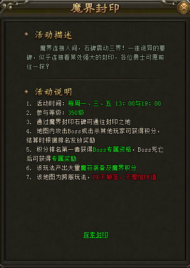 2)每周一、三、五的13点和19点,魔界封印入口会随机出现在烈焰战场