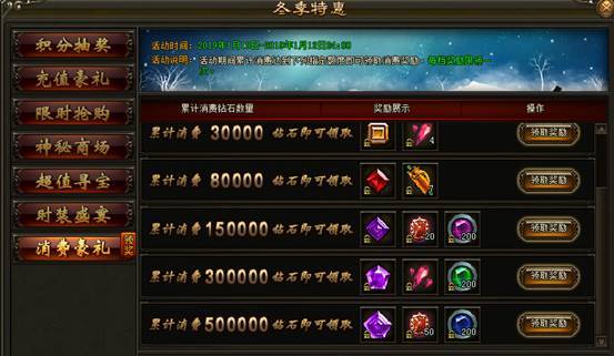 2. 活动期间内,消费指定档次的钻石可免费领取超级豪华礼包,更有高级攻击宝石、韧性宝石、九霄妖核、救赎妖核等稀有道具