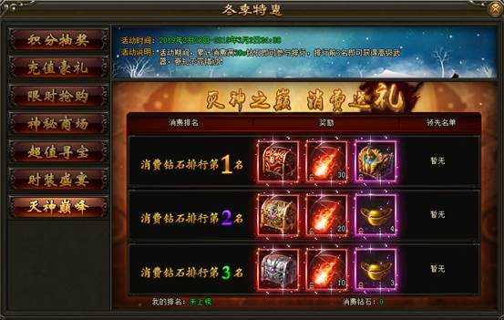 2. 活动期间内,累计消费满300000钻石即可参与排行,排行前3名的玩家可免费领取高级武器/灭神首饰箱、焚天异火、海量元宝等海量豪礼