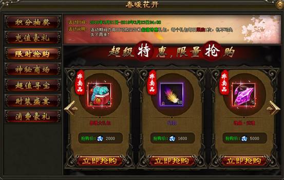 2. 活动期间内,神秘商场每日刷新各种珍稀道具,打折出售限量抢购。