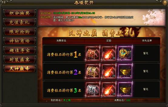 2. 活动期间内,累计消费满300000钻石即可参与排行,排行前3名的玩家可免费领取高级武器/灭神首饰箱、焚天异火、海量元宝等海量豪礼