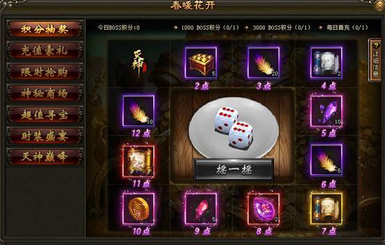 2. 活动期间内,玩家击杀boss可获得boss积分,boss积分数量达指定档次可免费投掷一次骰子,根据骰子点数可领取奖励。每日最多可获得三次