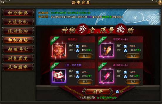 2. 活动期间内,神秘商场每日刷新各种珍稀道具,打折出售限量抢购。