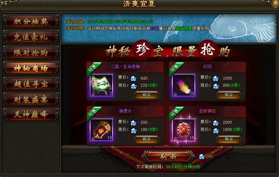 2. 活动期间内,神秘商场每日刷新各种珍稀道具,打折出售限量抢购。