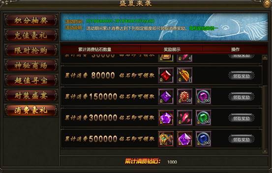 2. 活动期间内,消费指定档次的钻石可免费领取超级豪华礼包,更有灭神首饰箱、高级攻击宝石、韧性宝石、九霄妖核、救赎妖核等稀有道具