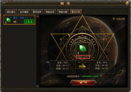 玩家可在锻造-星石升级界面,对星石进行强化升级,升级需要消耗星脉精华。
