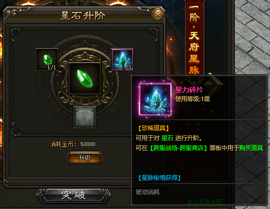 星石分十个等阶,消耗星力碎片,可提升星石的等阶。星力碎片同样可在跨服商店内消耗秘境积分购买。