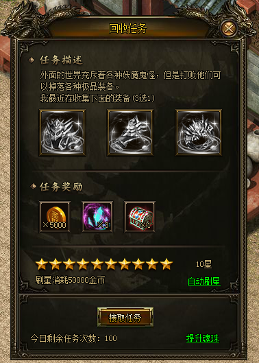 回收任务需要每次都要刷新到10星才能获得回收宝箱。