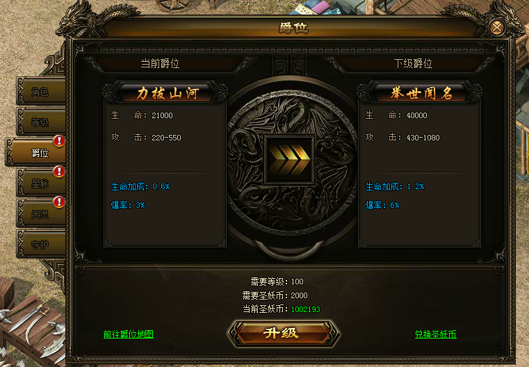 爵位系统升级消耗圣妖币,圣妖币可以通过金币兑换获得。